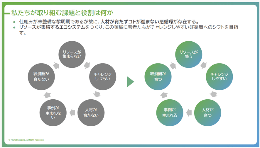 つまるところ、事業になりにくい環境なのでリソースが集まらず、人材も育たないので物事が進んでいかないという悪循環を生み出しているのです。「PLANET KEEPERS」では、この現状を好転させて、基礎研究なども含め、若い人たちが環境領域の事業に挑戦しやすくなる社会を目指しています。