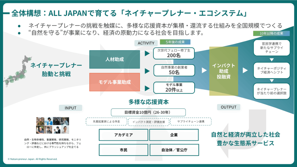 倉辻:より一層腰を据えて推進していくために、2025年7月に「一般財団法人ネイチャープレナー・ジャパン」を設立すべく動いているところです。「ネイチャープレナー」とは、Nature(自然)とEntrepreneur(つくる人)を組み合わせた造語で、自然領域を担う起業家精神あふれる人材を指しています。