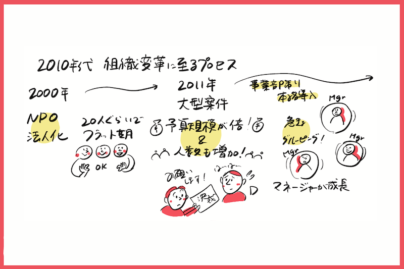 また同年には東日本大震災があり、急遽、東北復興支援チームをつくり予算獲得と寄付の募集に動きました。「事業部を組成した」と言うと聞こえがいいですが、実際はメンバーを突如グルーピングして「とにかくここで分担して頑張ろう」と対応せざるを得なかった状況で、組織に相当負荷がかかりました。