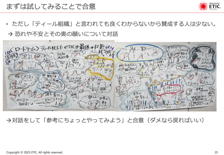 結果、様々な恐れがあることがわかりました。自由で分散型でみんなの価値観を大事にしてとなると、みんなやりたいことだけをやって副作用で一部の人に仕事が集中するとか、みんな自由すぎてだんだんチームが解散に追い込まれるとか。それすらも「NPOの役割を終えたからだよね」とポジティブに捉えて終わるんじゃないかとか。