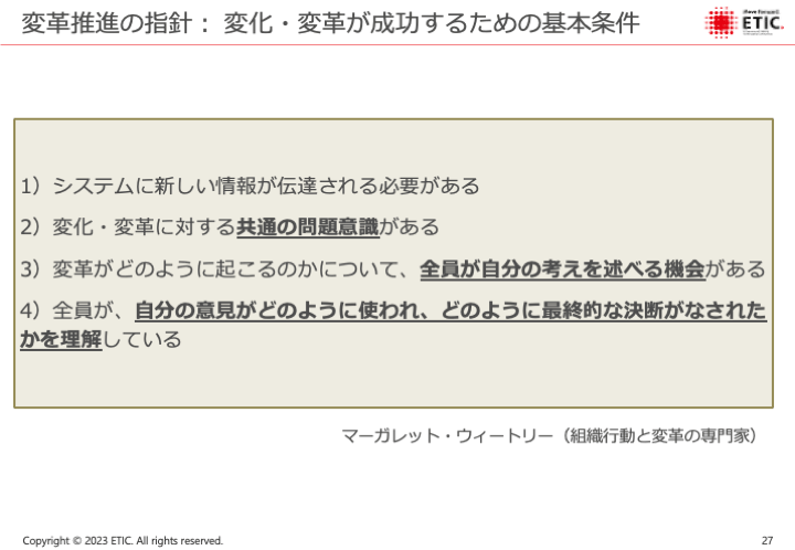 番野:ディレクターとスタッフがわざと対立する場所に座って、それぞれの声を出し切るというタフな対話もしました。このプロセスは、私自身にも多くの学びがありました。お伝えしたいなと思うのは、組織変革が成功するための基本条件です。私は特に下図の3と4の重要性を感じました。