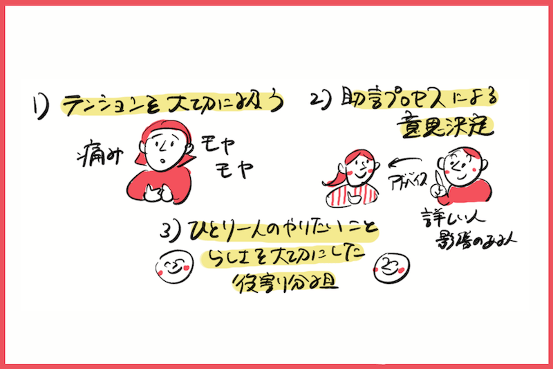 次に、「助言プロセス」というものを導入しました。これは意思決定をするときに決裁をすべてディレクターに仰ぐのではなく、その意思決定が影響を与える人と専門性を持つ人に助言を求めて、受けた助言を真摯に検討すればその本人が決めていいというものです。するとディレクター決裁行列待ちが解消してきて、一人ひとりのやりたいことを大事にできるようになっていきました。