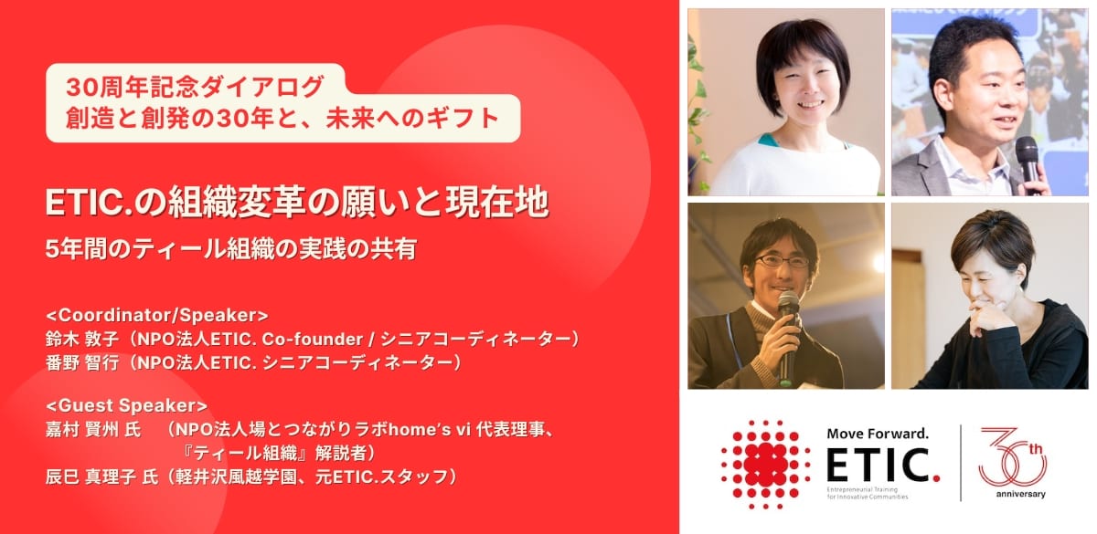1993年に学生団体として始まったNPO法人ETIC.(以下、エティック)は、2023年で30周年を迎えました。この連載では、皆さんと一緒に31年目を踏み出したいと、これまでのエティックを振り返るイベントとして開催された「30周年記念ダイアログ 創造と創発の30年と、未来へのギフト」のエッセンスをお届けしていきます。