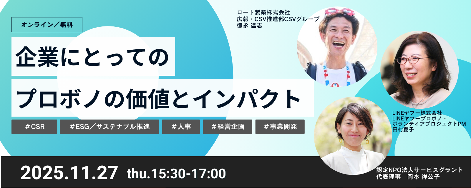 今回のイベントは、多数の企業でのプロボノ導入をサポートする「サービスグラント」、石川県能登地域で企業連携による復興支援を行う「プロボ能登(主催:LINEヤフー)」、そして組織を越えた社会課題解決に挑む「Beyonders(ETIC.、ロート製薬、アビームコンサルティング、日本航空)」の3団体が連携し、企業のCSR・人材育成・事業開発・地域連携の新たな選択肢として注目を浴びるプロボノの取り組みについてご紹介します。