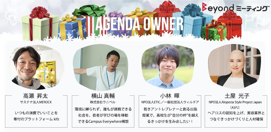 社会/地域課題解決や新しい価値創造に挑む人を“アジェンダオーナー”と呼び、全力で応援するブレスト作戦会議です。組織や立場の垣根を超えた化学反応を楽しみながら、予期せぬ出会いとアイデアで、新しい未来を創っていきましょう!