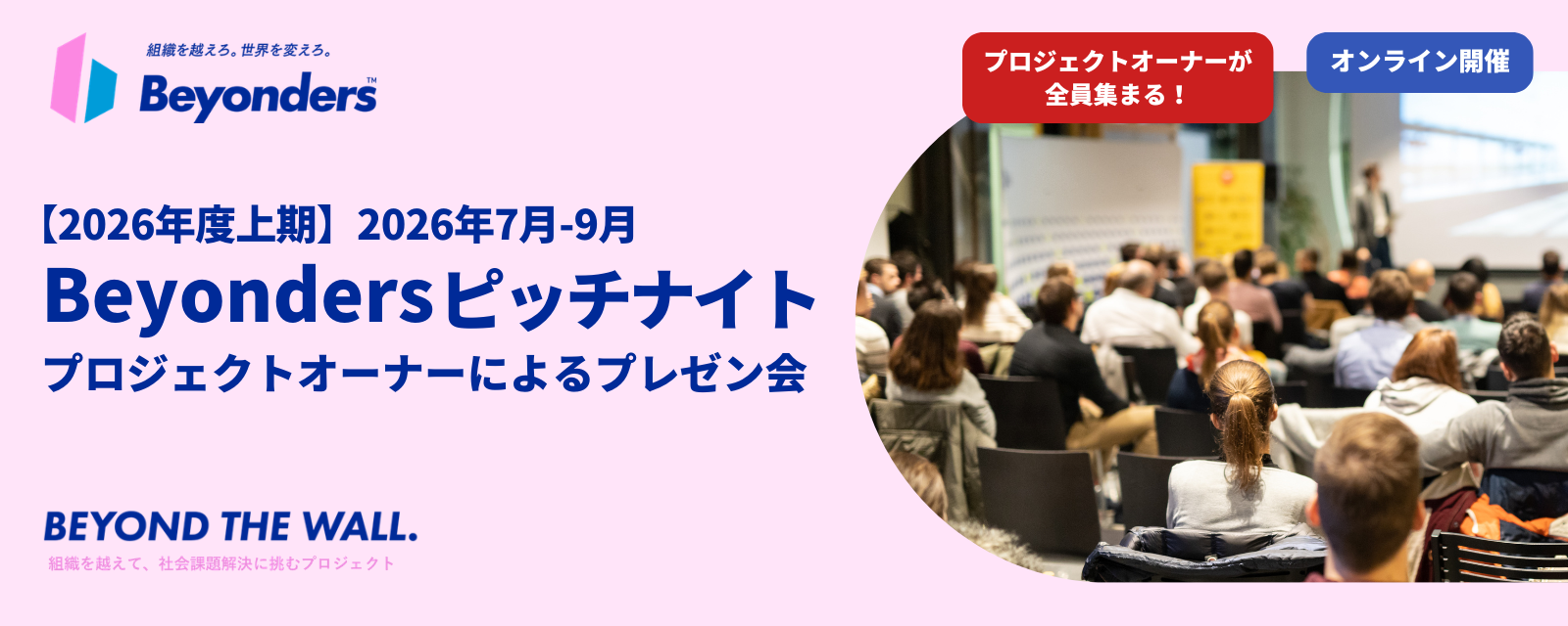 本イベントは、会社に勤めながらも、友人の起業を手伝うように、自分が共感する社会課題解決プロジェクトに3か月間期間限定で飛び込むプログラム「Beyonders」の2026年度上期(7月上旬-10月上旬)参加者募集に向けたピッチナイト(説明会)です。