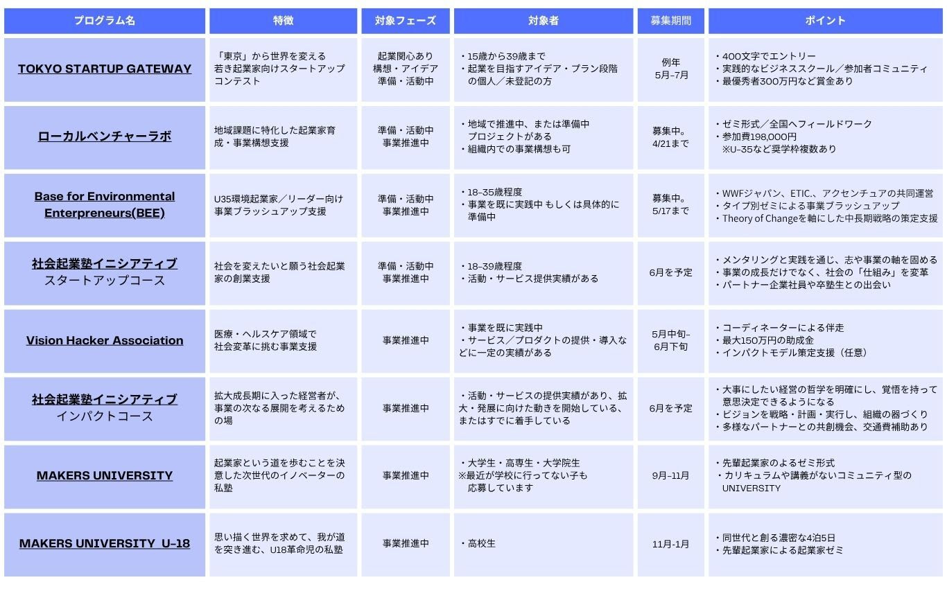 新年度がはじまり、新しい挑戦に向かう人も多い季節ですね。春からの上半期では、ETIC.のさまざまな「起業支援プログラム」の参加者募集がはじまります。今年は、上記8つのプログラムの予定です。(画像をクリックすると、WEBサイト上で拡大してご覧いただけます) もし起業に関心があったり、まさに今、立ち上げの最中にいたりする方は、それぞれのプログラムの特徴や募集期間などをチェックしてみてください。また、特定のイシューや地域、若者などさまざまな分野・角度から起業家・事業者支援をお考えの事業者・自治体の方がいらっしゃいましたら、気軽に情報交換できればと思います。ぜひ声をおかけください。 私たちは、1993年の創業以来、2260名の起業家のみなさんをサポートしてきました。今回は、起業・経営支援をとりまく最近の動向と、私たちの取り組みの変化についてお話したいと思います。特に2つの観点で変化を感じています。 1つは、よりテーマ(社会課題)を絞ったプログラムが増えている傾向があること。ネイチャーポジティブや子どもを取り巻く課題など、特定の課題に対して、その領域の専門性をもつ事業者と協働し、その分野の新しい挑戦や担い手を育てていこうという動きです。より特定のテーマに深くコミットしたいという、私たちの意思も大きく影響していますが、特定の領域で協働したいというニーズが増えていると感じています。また、そのようなスキームを組むことで、その分野に深く切り込み、知見をもつ先駆者をメンターに迎えながら、対話や学びを促進し、密度の濃いコミュニティを形成していくことができます。 もう1つは、起業・経営支援のノウハウを事業者の方々へ提供していく動きです。近年は起業支援に取り組む事業者は多様化しています。私設財団の設立や、特定の課題に取り組むNPOがその分野のプレイヤーを増やすために起業支援をはじめたりとさまざまな動きがあります。挑戦を応援する担い手が増えていくことは、とても喜ばしいことです。私たちは、そのような事業者のみなさんが、スムーズに支援の仕組みを立ち上げられるよう、プログラムの設計や推進を共にしながら、自立的に起業支援をできるようになるまでのサポートをしています。 このように、上記にリストアップしたETIC.主体・事務局の起業支援以外にも、さらに活動の輪は広がりをみせており、スタッフ一同、協働する仲間が増えていくこと、その先により多くの人たちを応援できることをとてもうれしく思っています。